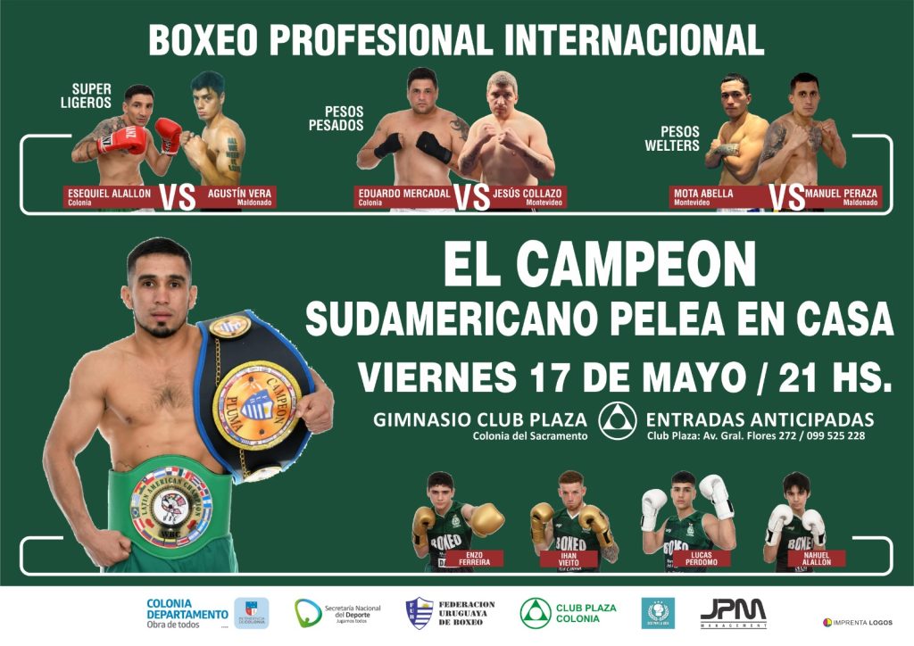 Este viernes 17 de Mayo a las 21 hs, Rubén Mariachi Casero vuelve a pelear en el Club Plaza Colonia tras haberse consagrado campeón uruguayo y sudamericano del Consejo Mundial de boxeo. Además estará el debut profesional del colonienses Esequiel Alallon y por primera vez defendiendo los colores albiverdes el peso pesado Eduardo Mercadal. También […]